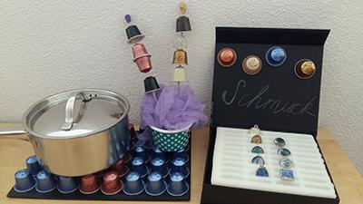 Schmuck,Topfuntersätze und Dekosachen aus gebrauchten Kaffeekapseln.
